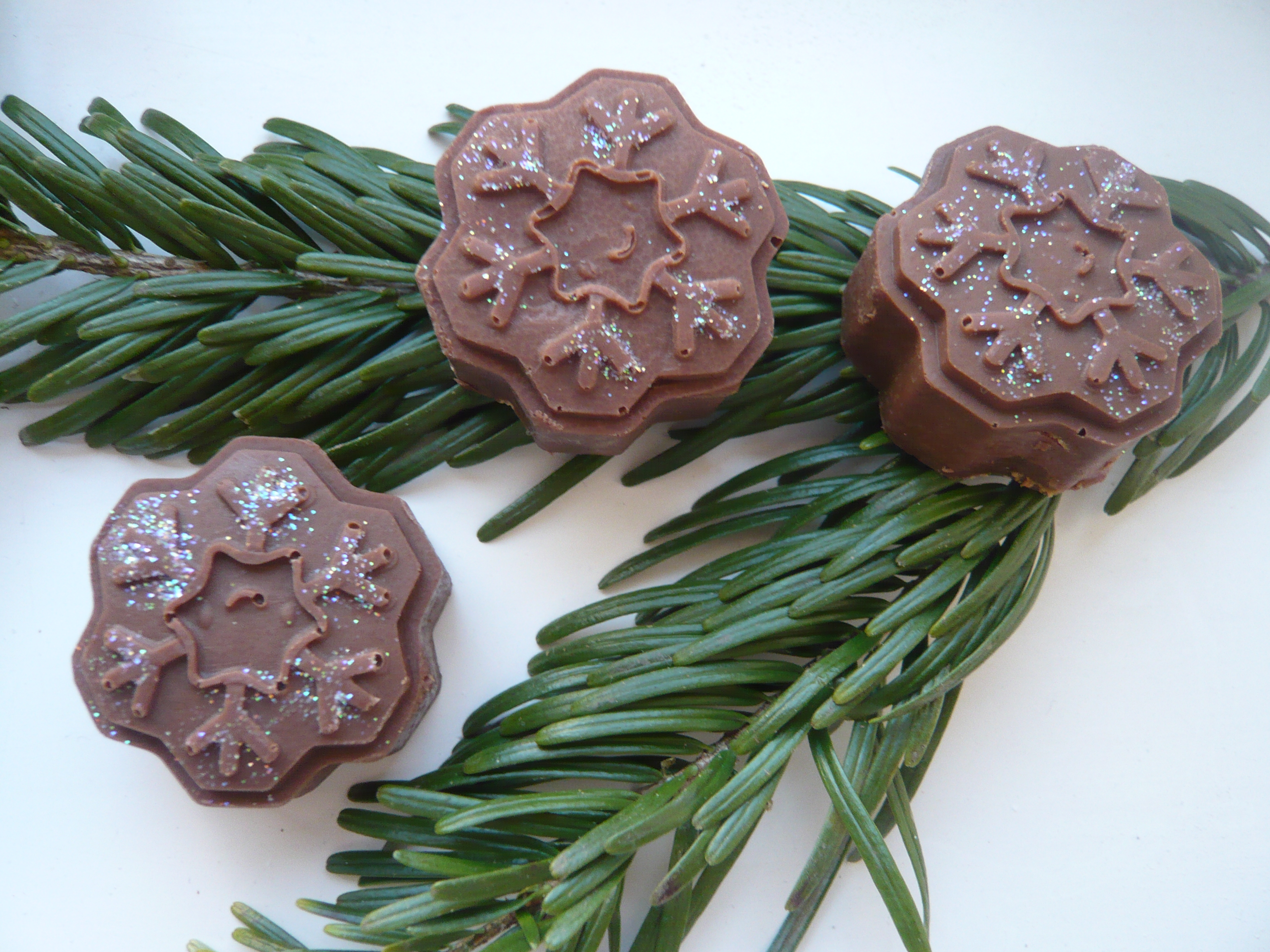 Melt the chocolate and put a little bit of the melted chocolate in the bottom of the ice cube tray and up the sides of the individual ice cube moulds. Let set in the fridge or the freezer for ca. 10 minutes. Meanwhile, carefully nuke the Spekuloos spread in the microwave (this burns quick so 30-40 secs on high is plenty). Put a small quantity of the Spekuloos spread in the ice cube moulds and cover with the remaining chocolate. Let set in the fridge. Unmould and decorate with some edible glitter. Hmmm…