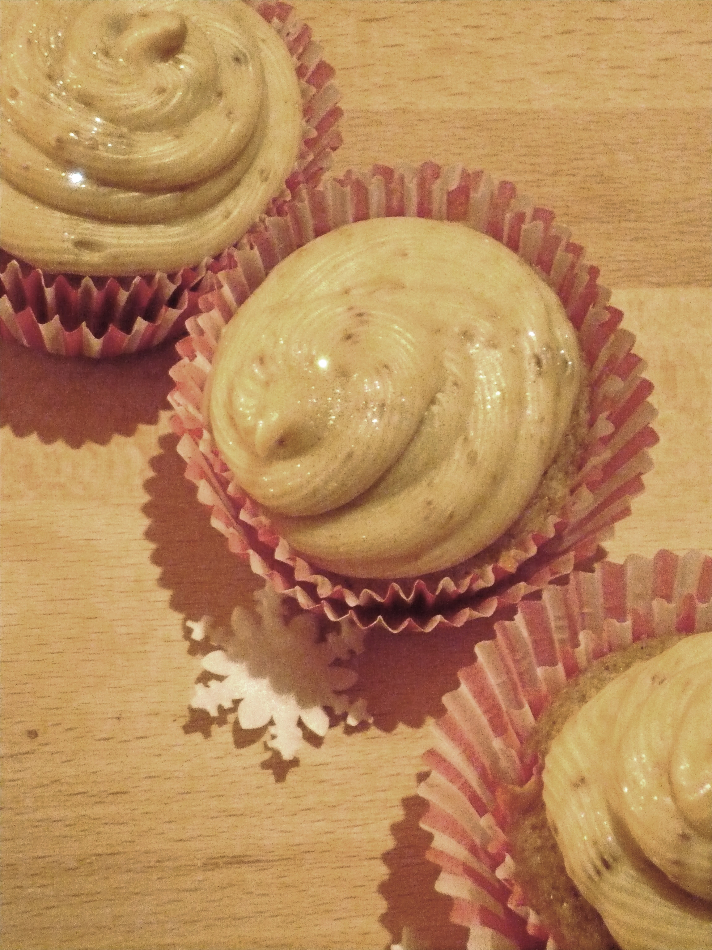 For the frosting, beat the icing sugar and butter on slow speed until combined. Add the cream cheese and the Spekuloos spread in one go and mix until combined with the icing sugar-butter mix. Beat (I usually do this by hand, but a free-standing mixer is easier on your arms!) on high speed until the frosting is light and fluffy (ca. 5 minutes). Be careful not too overbeat the frosting as it can quickly become runny. Place the frosting in the fridge for 1-2 hours (the frosting will become thicker in the fridge so it will be easier to pipe). I like piping the frosting with a star or round nozzle but you can also just spread the frosting with a palette knife or a normal knife. If available, dust with some edible glitter for some Christmas sparkle!