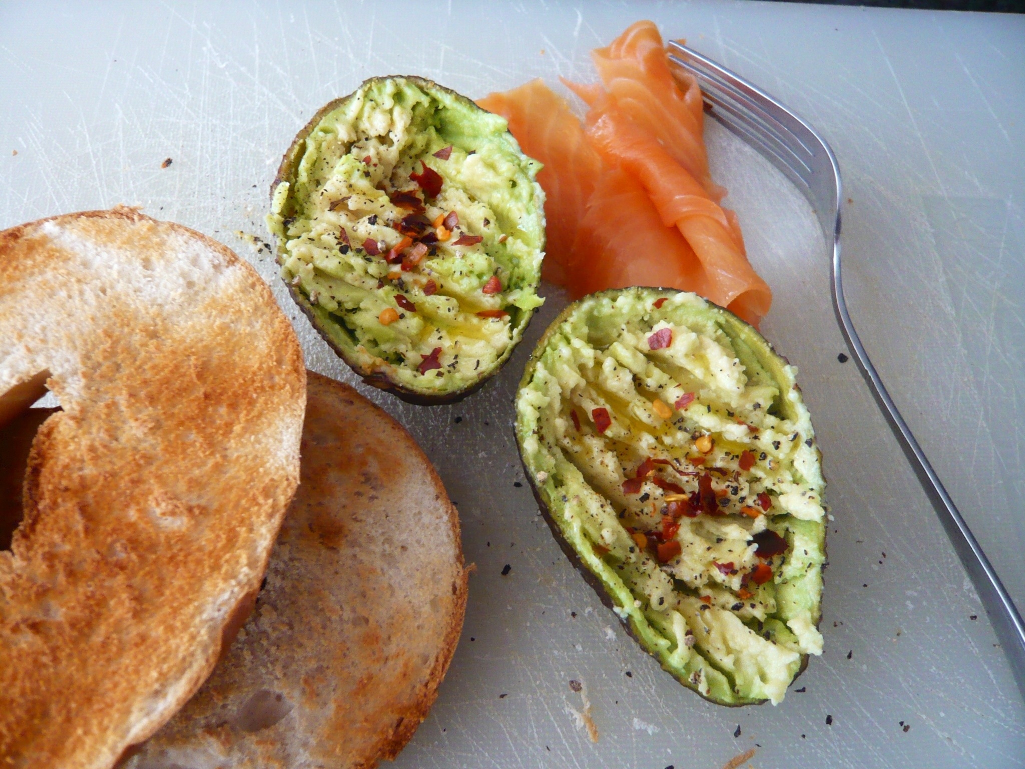 And that is exactly what I did for lunch the other day. Ever since discovering toast with mashed avocado at the hopelessly hip Caravan on my beloved Exmouth Market, I have been obsessed with mashing ripe hass avocados on toasted sourdough bread, with a sprinkle of salt, pepper and chili flakes for some heat, a squeeze of lime if I am feeling adventurous and a drizzle of good olive oil if I feel like it. Well, folks, yesterday I turned it up another notch – I added smoked salmon and some lemon olive oil to the mix and, what can I say, not only is this lunch ready in the time it takes for my toaster to spit out two nicely browned bagel halves, it tastes absolutely phenomenal.