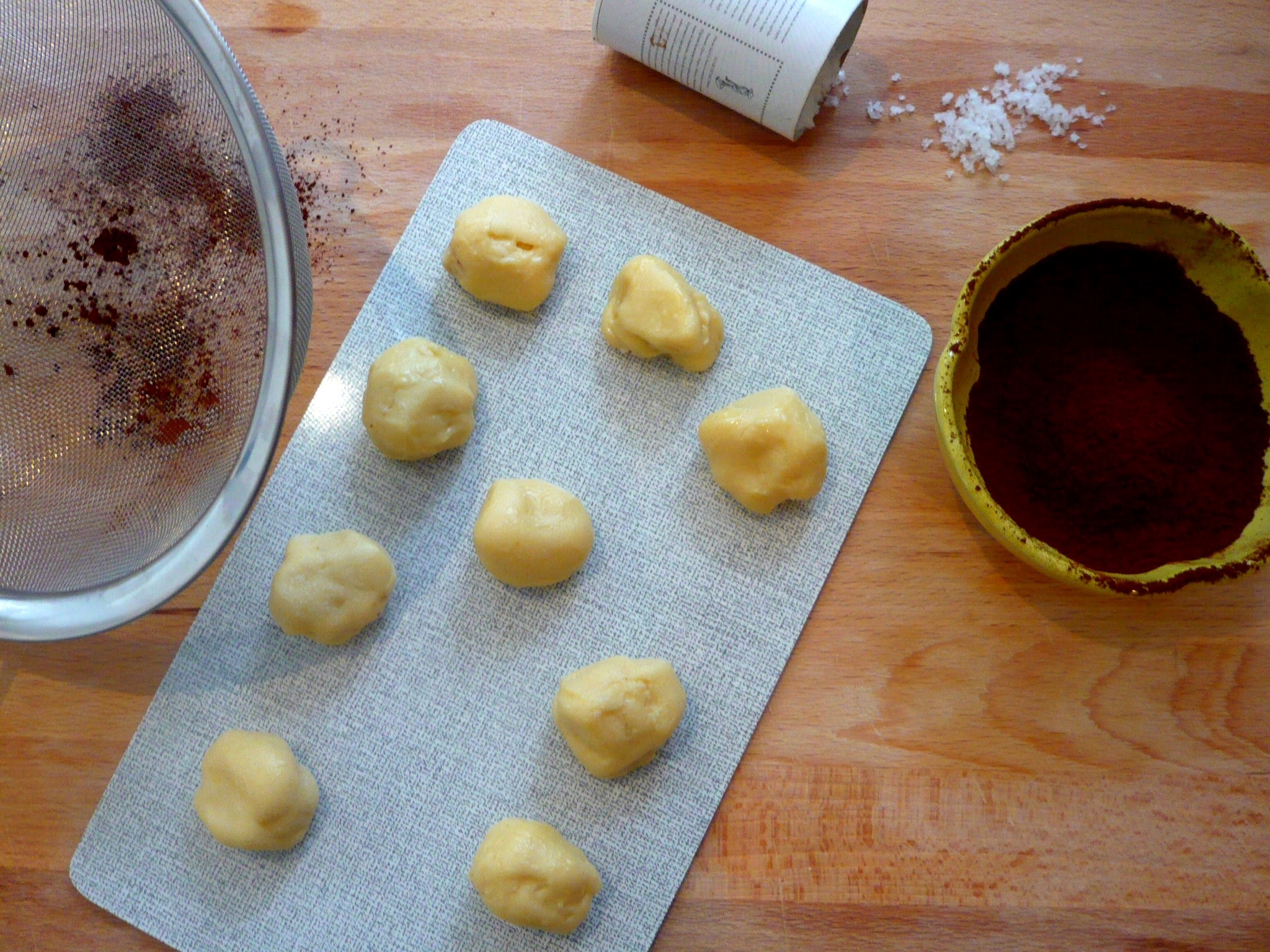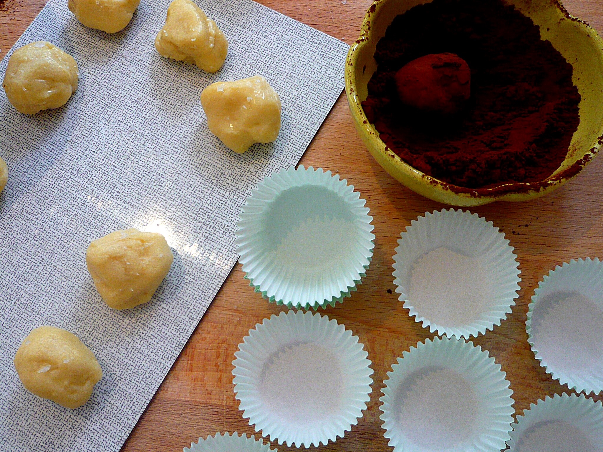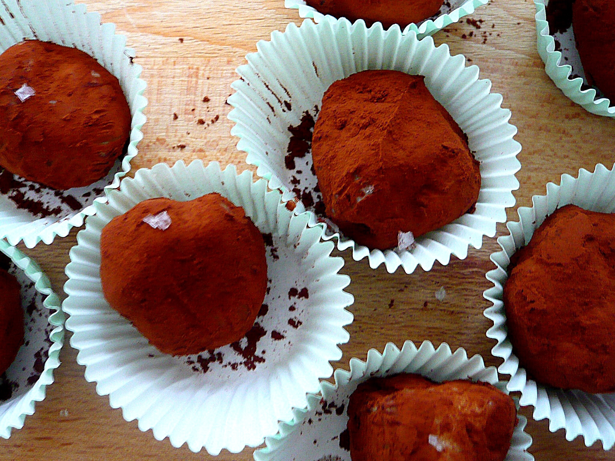 Sprinkle some fleur de sel over your little ganache balls, roll in cocos powder, sit in mini cupcake liners and decorate with a single salt crystal.
