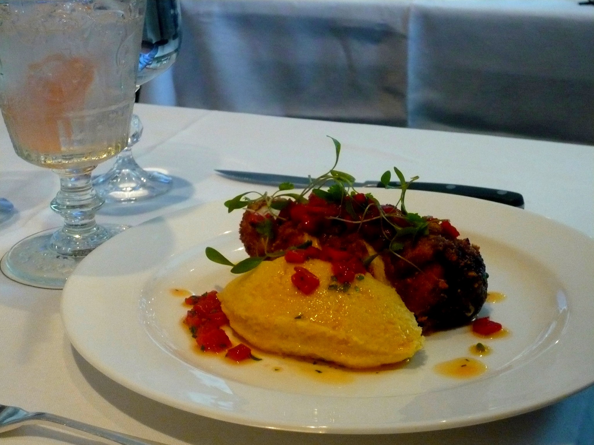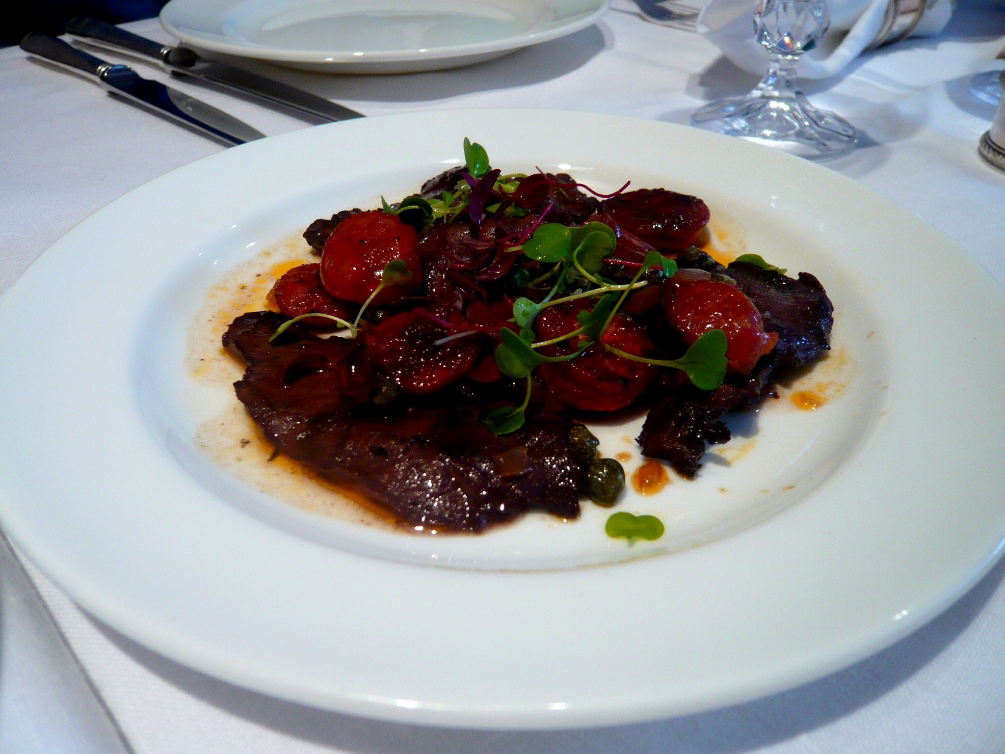 My favourite of the two starters was the panko-covered deep-fried calamari rings served on a bed of fennel slices and drizzled with a black olive tapenade. I usually find black olive tapenade far too salty but here the saltiness was finely balanced and played off so well against the fresh fruity and liquorice flavours from the fennel. A nice addition to the dish were the fennel seeds that had been mixed with the panko crumbs – I usually never season panko or bread crumbs with anything more than salt and pepper but I have clearly been missing out!