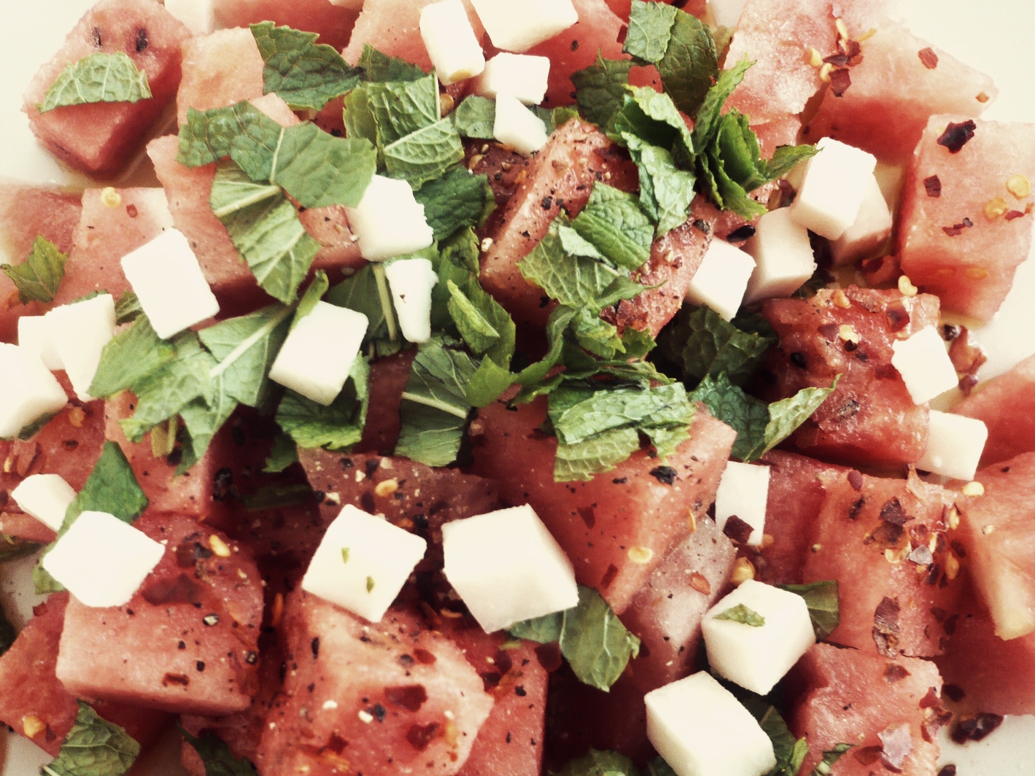 1. Combine the diced watermelon, the goat’s cheese and the chopped mint on a plate.