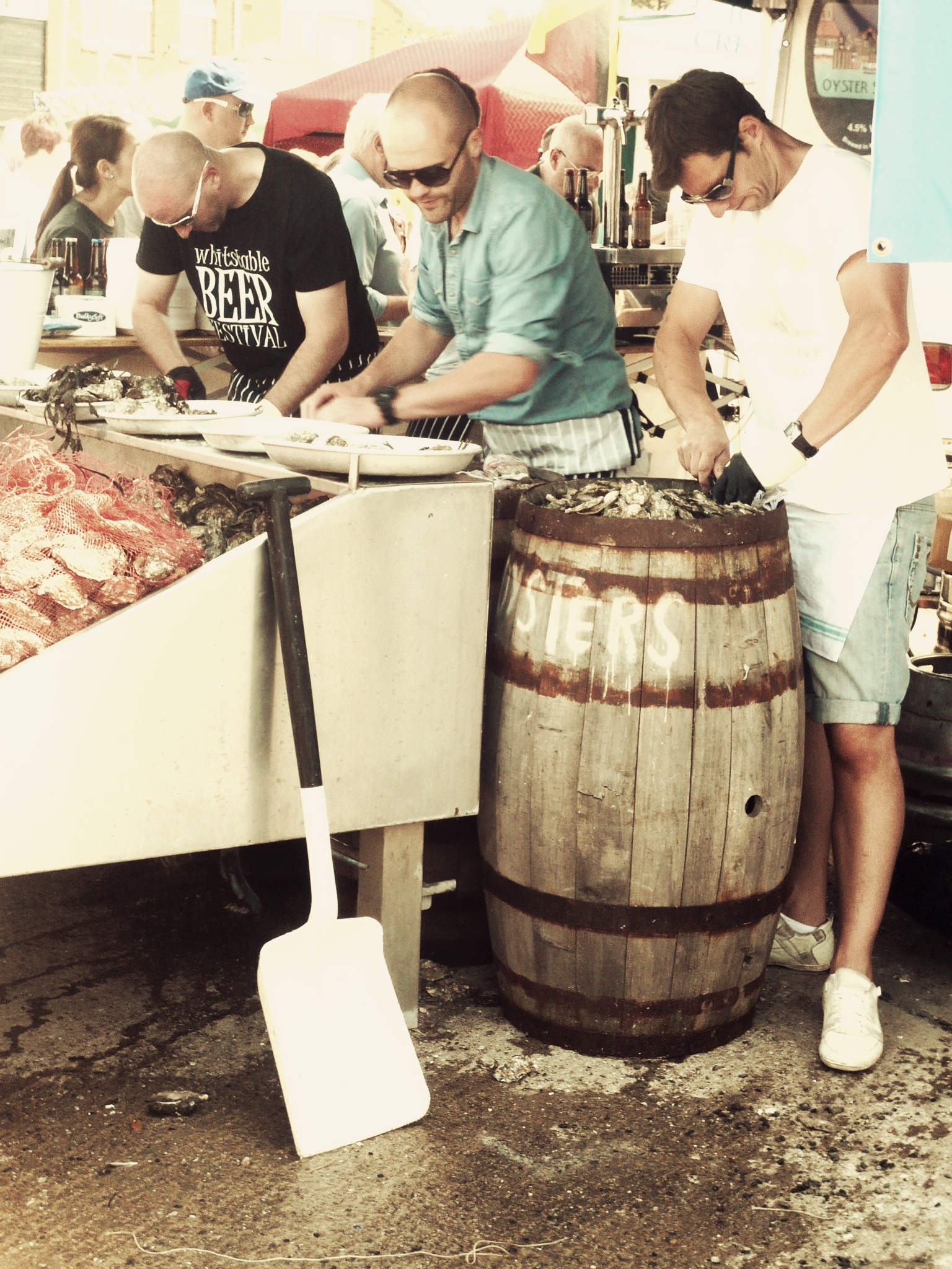 I leave you with some pictures from Alessandro’s and mine recent trip to Whitstable for the annual oyster festival. After weeks of rain and temperatures below 20 degrees suddenly the clouds lifted and we were blessed with a gorgeous sunny and hot day, perfect for walking around this little seaside town, drinking the local beer and munching on fresh seafood. I am still not an oyster aficionado but one or two, with a good squirt of lemon juice, can actually be quite nice and refreshing on a hot summer’s day.