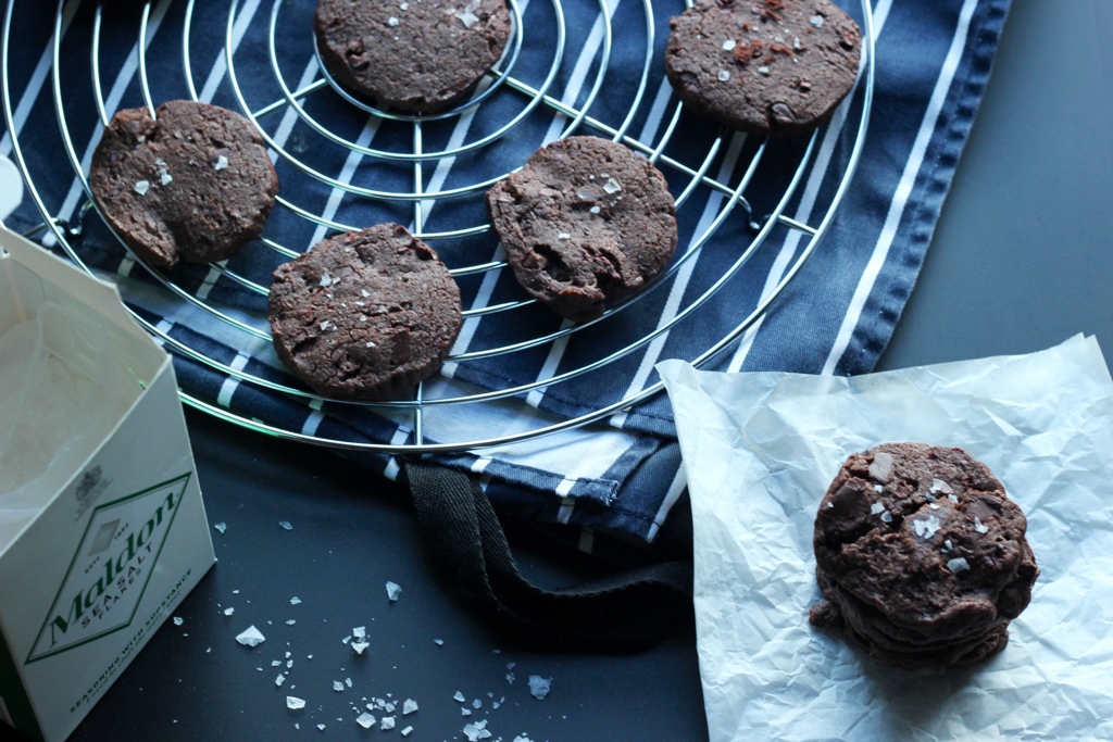 The simple trick with these cookies is the immense hit of chocolate you get when you bite into them. Rather than adding melted chocolate or cocoa powder to a standard cooke recipe (which often changes the texture, resulting in a dense or dry cookie), I replaced some of the flour with cocoa powder and then added chocolate chips and cocoa nibs. I also reduced the sugar slightly from the original recipe as I did not want these cookies to turn out overly sweet and sickly which would have only distracted from the dark chocolate flavour. Lastly, a shot of espresso and a good pinch of salt make the dark chocolate flavour of these cookies really ‘pop’.