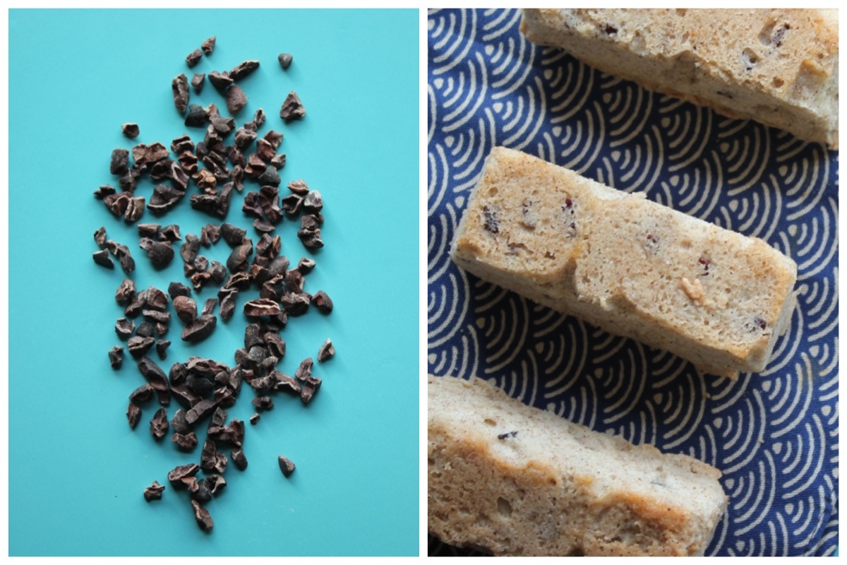 Cacao nibs are basically the fragments of crushed cacao beans (once they have been dried and fermented), used in the production of cacao paste (also called chocolate liquor), a key ingredient in the chocolate bars most of us wolf down to get past that mid-afternoon slump at work. Cacao nibs are crunchy, similar to toasted nuts, and have an intense chocolatey taste not unlike very dark chocolate, which is why I like to call them chocolate chips for grown-ups. I love adding them to quick breads like this Orange Chocolate loaf, cookies (or even on top of ice cream) – they are wonderfully crunchy when raw yet become softer and with an even more intense chocolate taste once baked. Buckwheat goes really well with cacao nibs and here the nibs give a little bit of bite to these otherwise very soft and spongey little cakes. If you don’t have any cacao nibs, feel free to use chocolate chips or chopped nuts (I think walnuts would go particularly well with these).