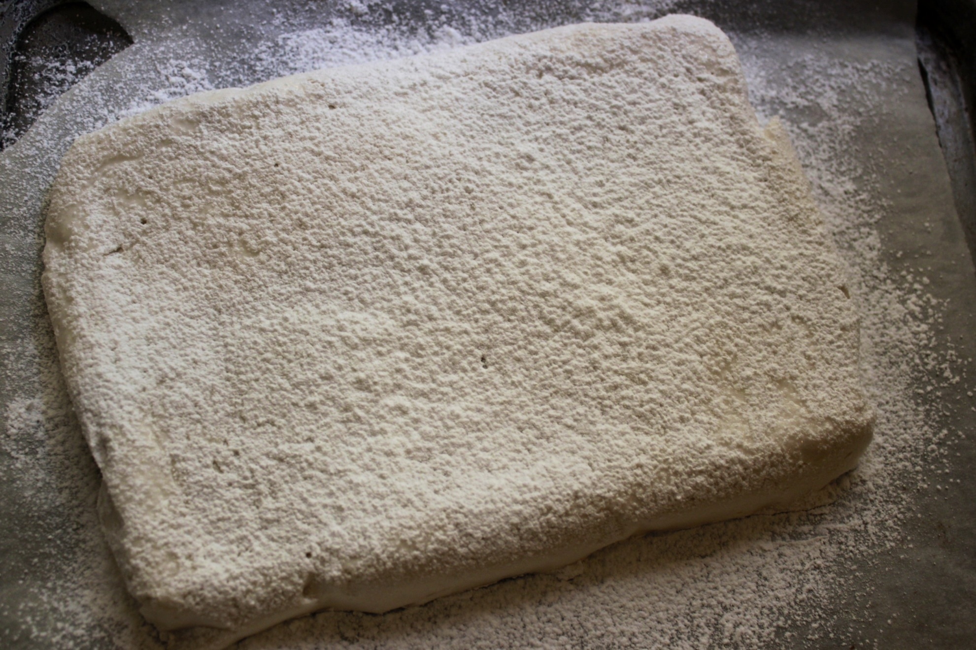 4. Scrape mixture onto the baking tray, trying to distribute it evenly. Leave to set overnight or for 10-12 hours before turning the marshmallow slab onto a cutting board covered in a thin layer of the enrobing mixture. Dust more enrobing mixture onto the side facing up before cutting the marshmallows into small squares or any other shape you would like (this is easiest if you use a knife dipped in boiling water and dried with a tea towel, repeating this every so often once the marshmallow starts sticking to the knife). Dust the cut marshmallows in the enrobing mixture, making sure all sides are covered, and store the marshmallows in an airtight tin.