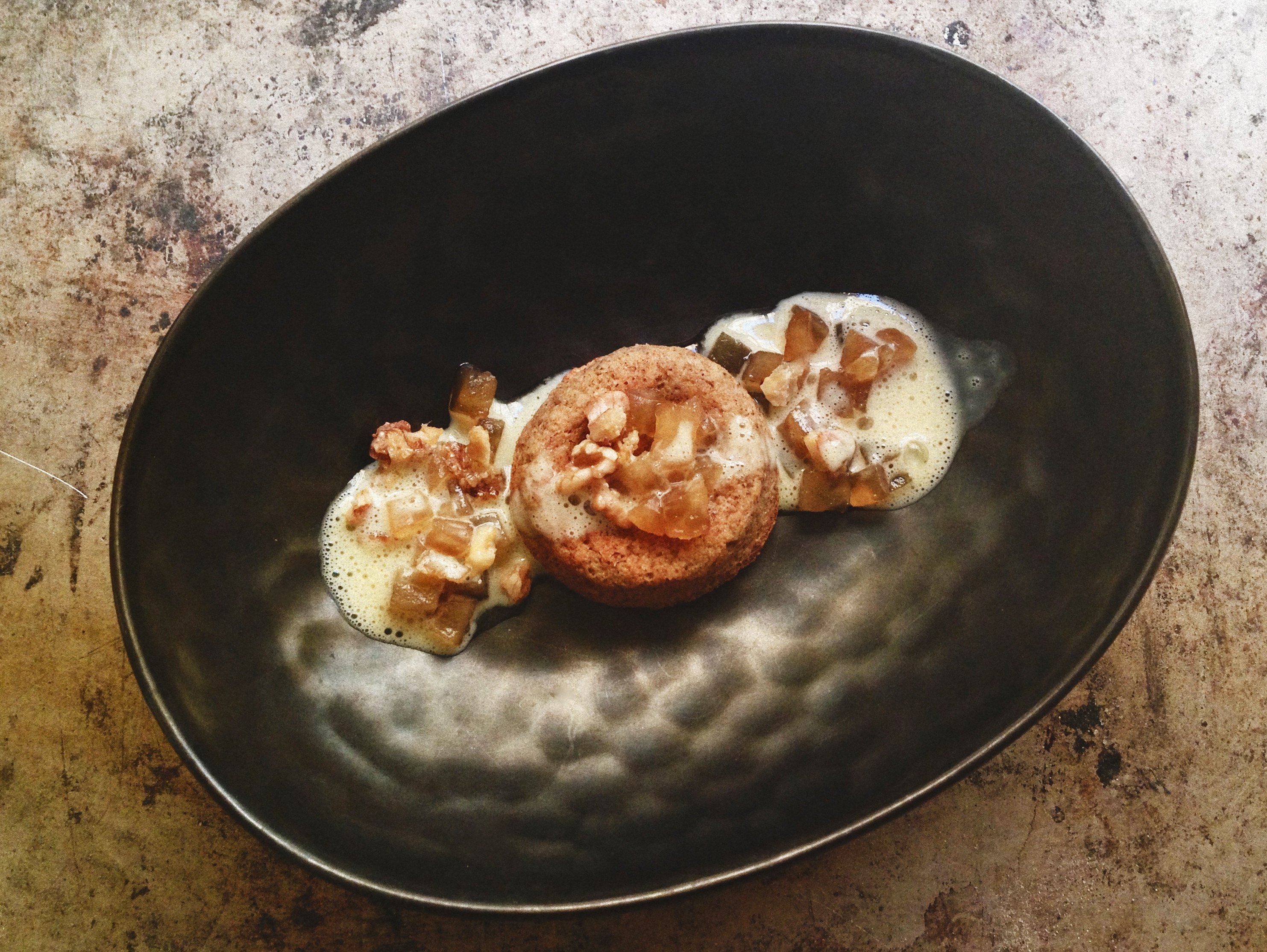 I am still intrigued by the idea of a white gingerbread cake (which may not end up containing any ginger at all, in which case I will need to think of a suitable alternative name) and will re-visit this idea in due course. What did work really well the first time I tested it was a simple dessert marrying the flavour of celeriac with coffee, walnut and vanilla. The dessert you can see in the above picture consists of four different elements: candied celeriac, a crème anglaise, coffee and walnut mini cakes and caramelised walnuts.