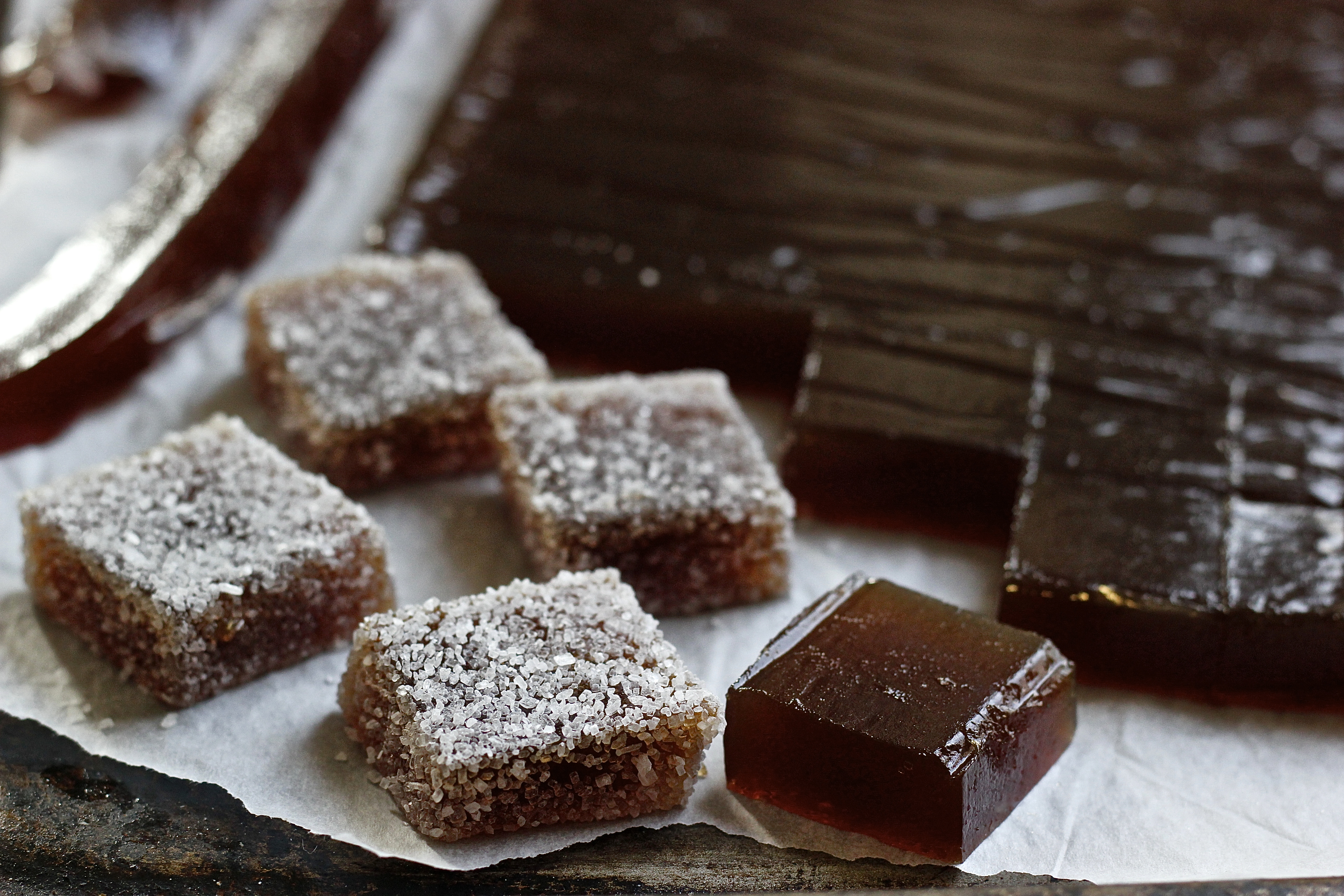 Note: This recipes makes a lot of pate de fruit – about 40 pieces (more if you cut them smaller). While you can half the recipe, I would only do so if you have an instant read sugar thermometer or a saucepan small enough to allow for a proper reading on your thermometer so you know when the pate de fruit has cooked long enough. Sadly my kitchen lacks both so I used a medium-sized saucepan and my trusty thermometer my sister gave me. In any event, stored somewhere cool in an airtight container, the pate de fruit will keep for a few weeks. As an alternative to serving the pate de fruit alongside coffee, you can also serve it with cheese, similar to the way you eat membrillo or chutneys with cheese (if so, skip the part where you roll the pate de fruit in sugar).