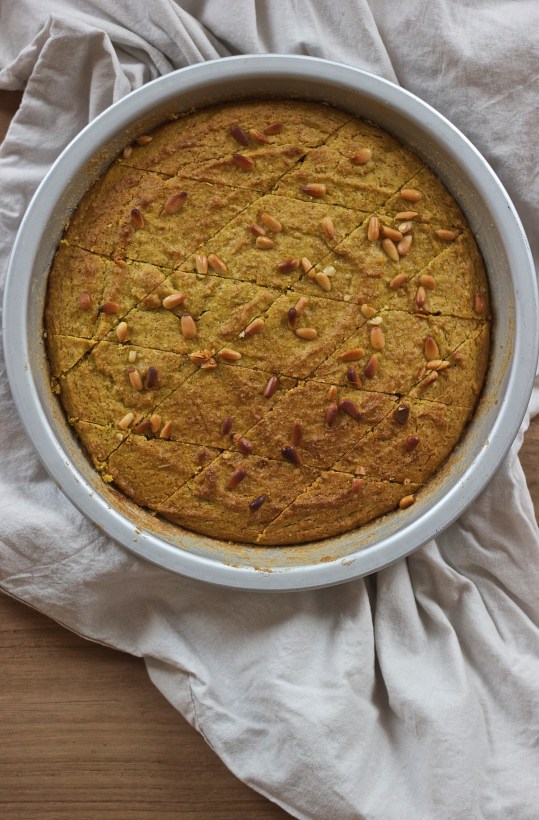 Note: I have seen recipes for Sfouf made with and without ground anise. I am rather partial to anise’s flavour so have included it here – the combination of the turmeric and the anise gives this cake a beautifully earthy yet delicately sweet flavour. As the cake contains no eggs and is made with vegetable oil instead of butter it can easily be made vegan – simply substitute a plant or nut milk for the milk.