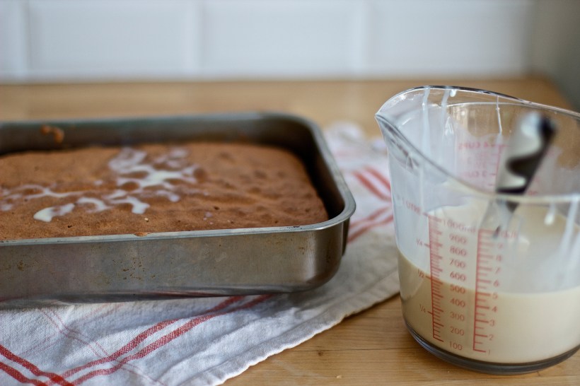 Mix together the three milks and pour over the cake. Initially it will look like it is far too much liquid but the sponge will eventually soak it all up.