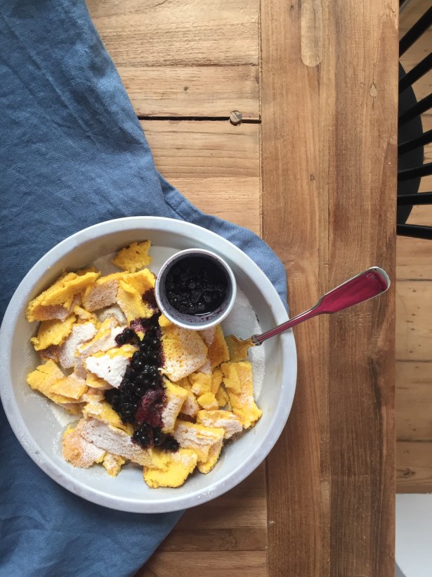 Kaiserschmarrn (pictured above) refers to a type of pancake common in Austria, Germany and Switzerland. They are unusual in that they have a very low ratio of flour to eggs and milk – resulting in a very eggy pancake. Plus, the eggs are separated and the whites beaten until stiff and then carefully folded back into the batter. So you end up with a beautifully light pancake. But don’t be fooled – Kaiserschmarrn itself is far from a light affair – because once each pancake is ready, it gets torn into smaller pieces which are then re-fried in butter before the whole thing is dusted with icing sugar and served with jam, fruit compote or apple sauce. And did I mention that the batter typically also includes rum-soaked raisins?