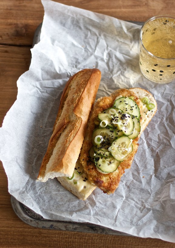 But today I have another idea for you. A Schnitzel Baguette. But different. This one gets a schmear of the miso aioli, then a panko crusted pork cutlet, plus soy sauce and sesame oil cucumber salad and a sprinkle of sesame seeds and spring onion. What would bring this entire thing over the top would be a cold Kirin on the side to wash this all down!