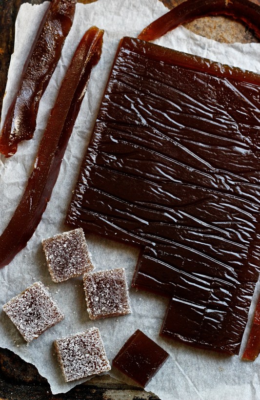 Pâte de Fruit is essentially a wine gum made with fresh fruit juices or purees and sugar which is set with the help of pectin. Once set, the pâte de fruit is cut into smaller shapes (small squares or disks are common but you could also use small cookie cutters for different shapes) and rolled in sugar to avoid them sticking together. This Tamarind Pâte de Fruit is a bit more unusual in flavour and is also a fantastic way of using up that open jar of tamarind paste at the back of your fridge. This time of year you could of course also make a mulled wine pâte de fruit by replacing the tamarind water with homemade mulled wine. Click here for the recipe.
